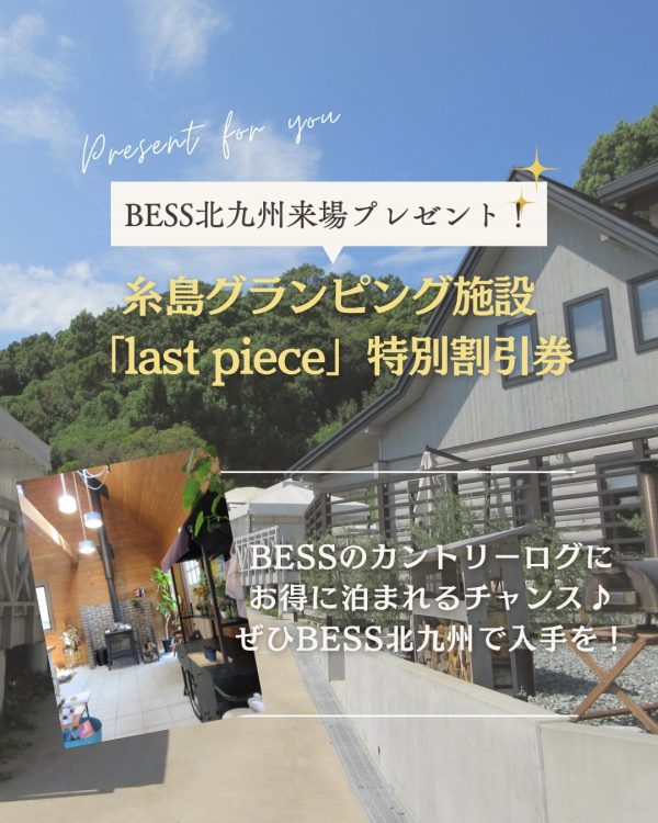 【BESS北九州来場プレゼント!糸島グランピング施設「last piece」特別割引券】BESSのカントリーログを、受付棟と唯一のログ棟に選...続きを読む